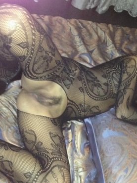 Брюнетка в сексуальной сетке позирует с обнаженной пиздой